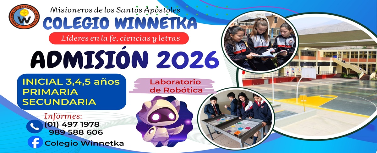 Presentamos la oferta educativa de nuestro Colegio WINNETKA, son 72 años de servicio a los niñ@s, adolescentes y jóvenes de la localidad de Chaclacayo y alrededores. La presencia de la Congregación Religiosa de los Misioneros de los Santos Apóstoles, como los promotores de nuestra institución, nos permite desarrollar una identidad y un carisma de servicio basado en la práctica de los valores cristianos. ¡Ser winnetkino es dar lo mejor!